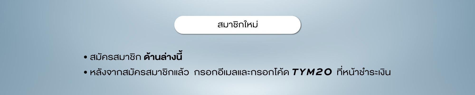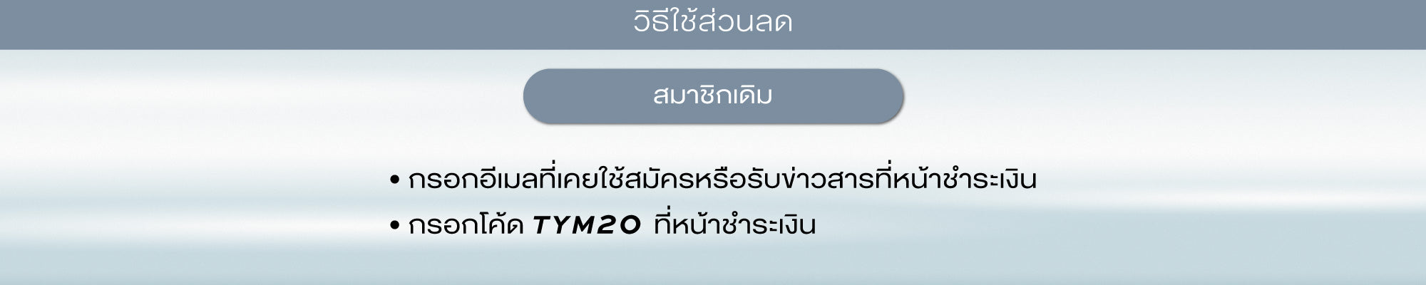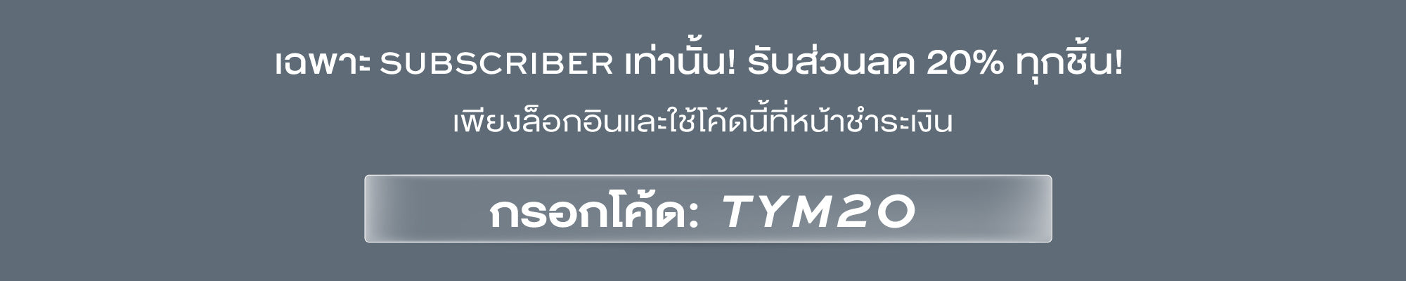 - รับส่วนลด 20% สำหรับสินค้าทุกชิ้น เมื่อกรอกโค้ด TYM20 ที่หน้าชำระเงิน