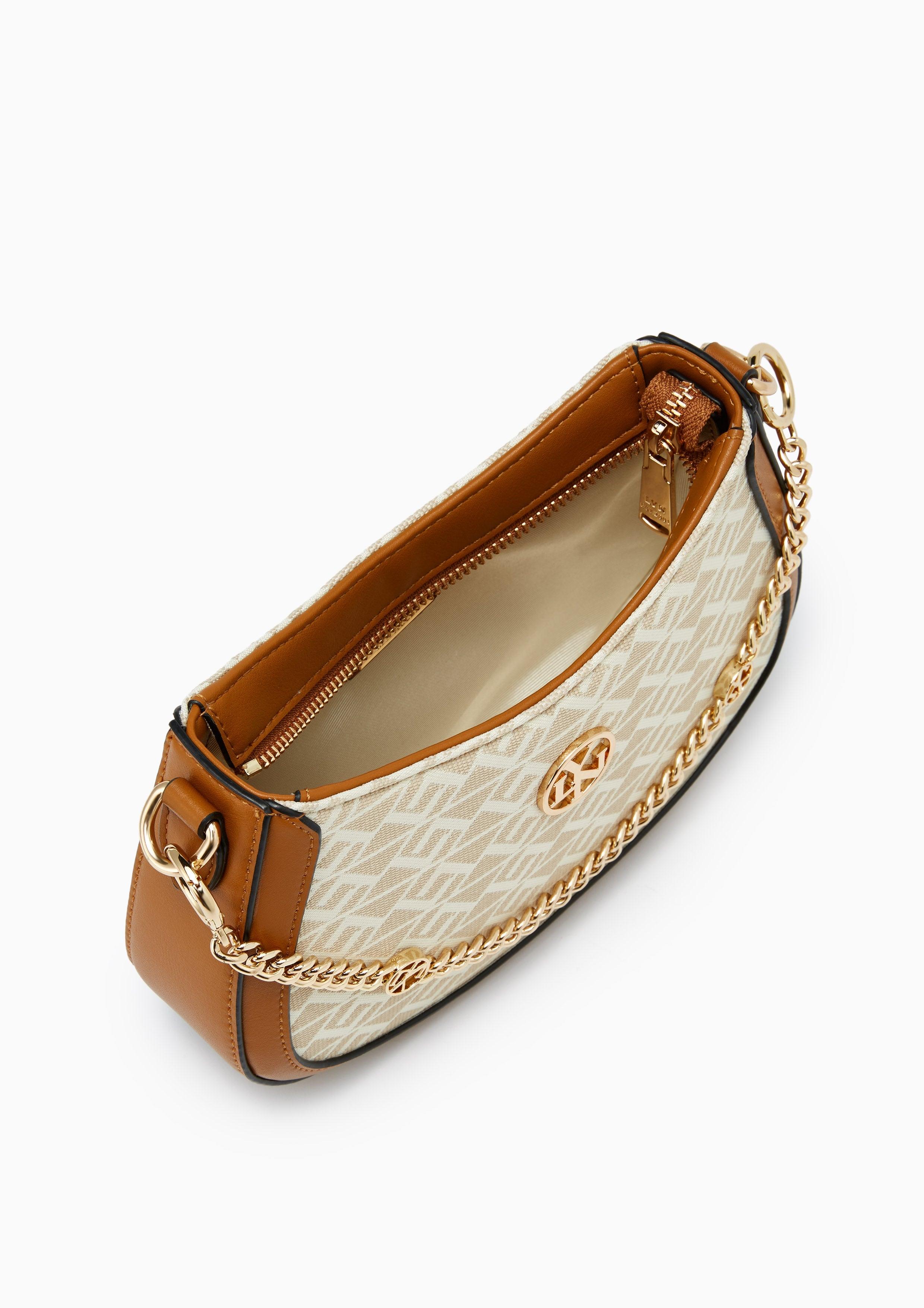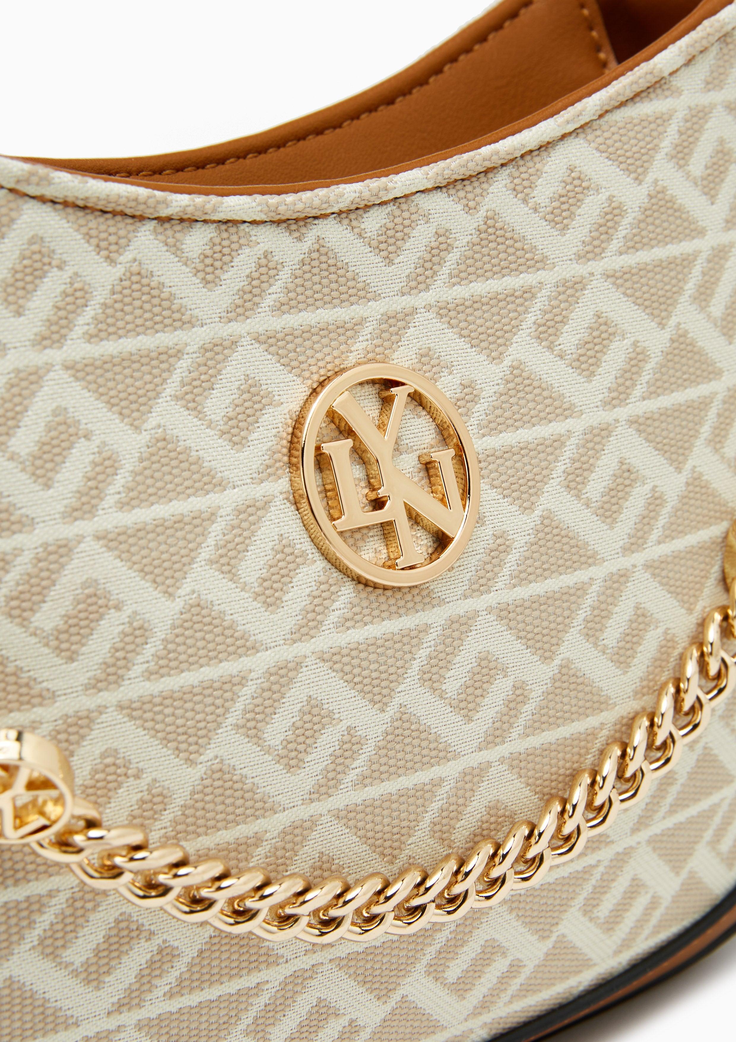 The Mona Mini Shoulder Bag showcases contemporary style with its signature monogram denim pattern and leather trim detailing. Distinguished by Lyn's medallion logo and a decorative chain accent, this curved silhouette combines casual refinement with versatility. The adjustable leather strap and practical size create an ideal everyday accessory.
