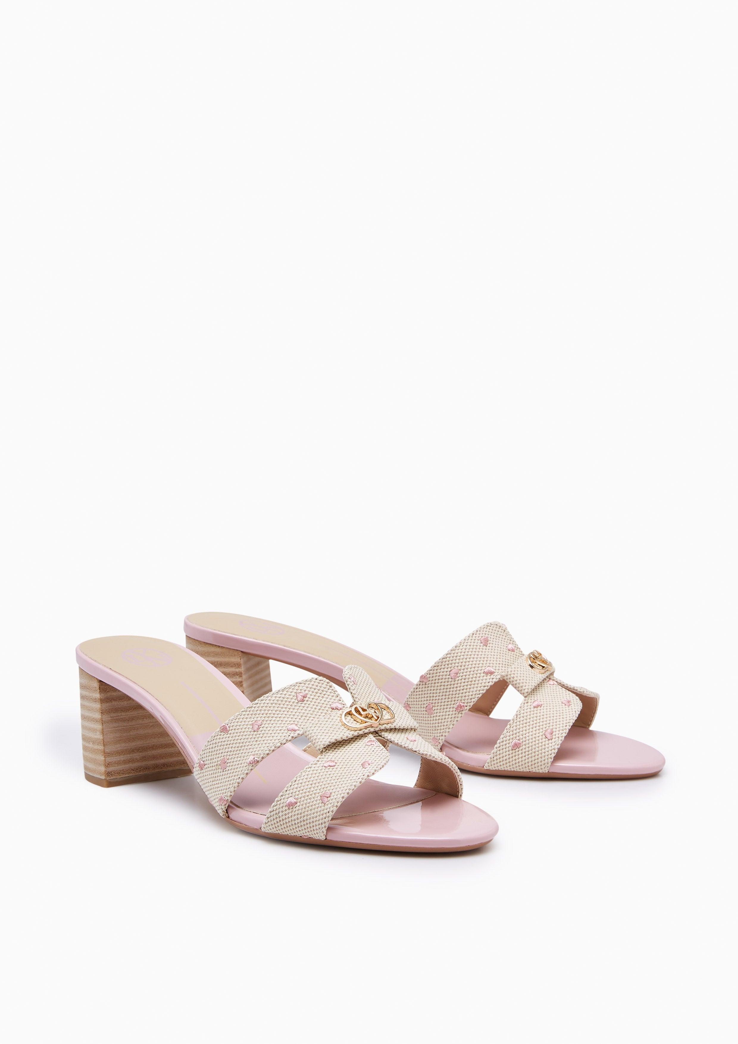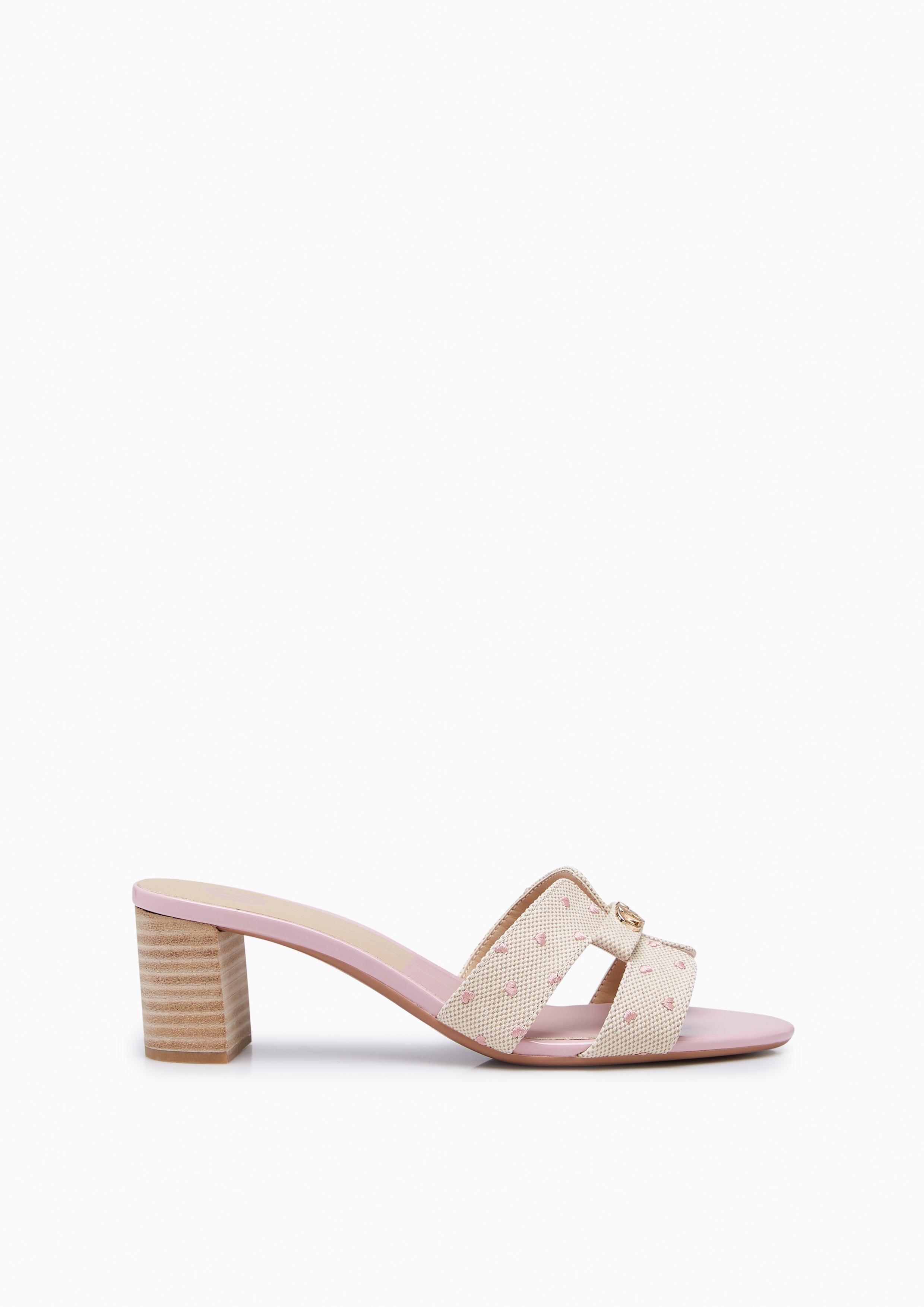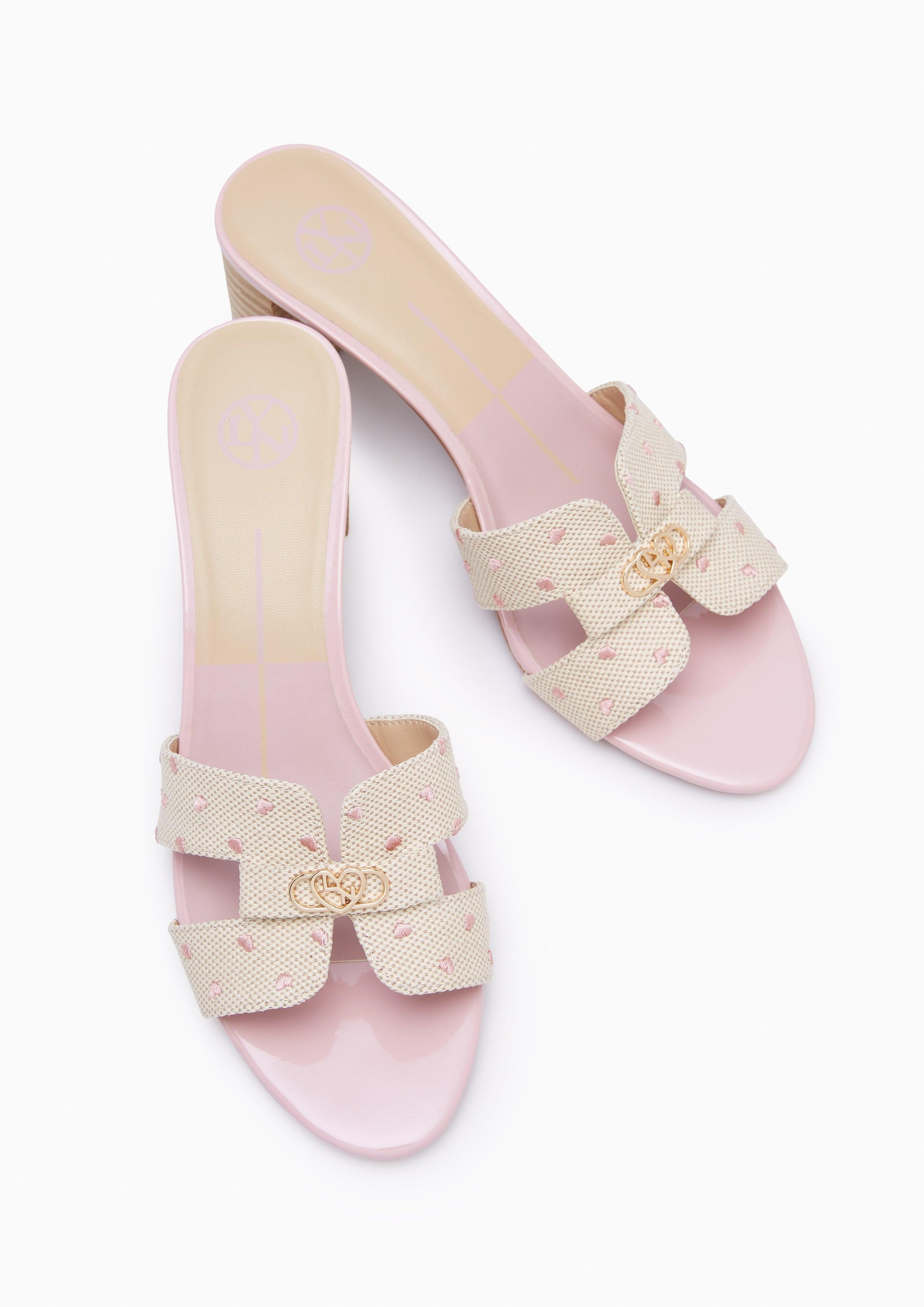 Experience refined grace with the Hey Lovely Canvas Mid Heels. These elegant mules feature a textured canvas upper with delicate heart prints, beautifully arranged in an H-strap design and adorned with Lyn's signature golden heart-chain emblem. The natural-toned stacked heel complements the soft canvas texture, while the base adds a feminine touch. Perfect for both daytime sophistication and evening elegance, these mules embody Lyn's commitment to versatile, polished style.