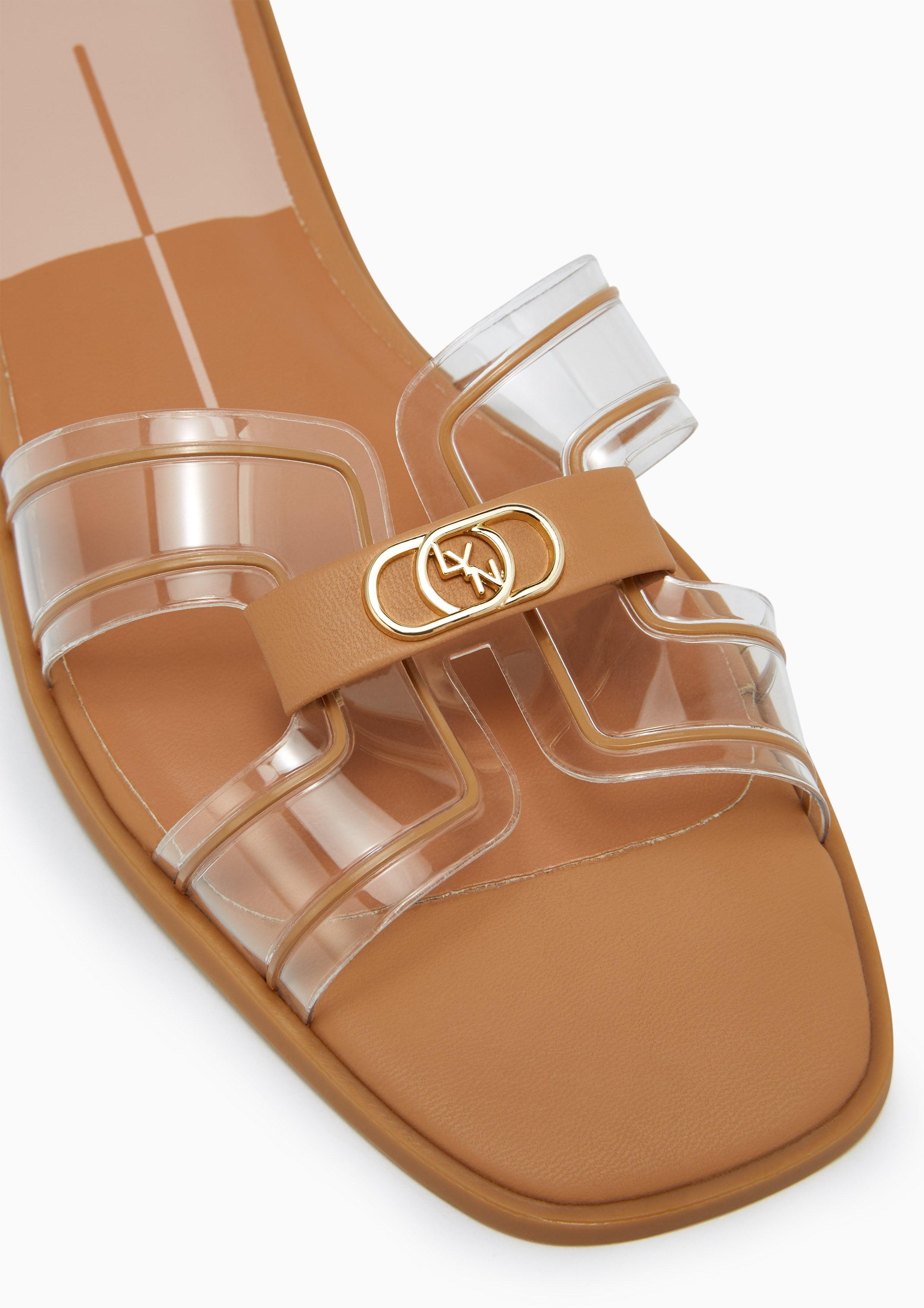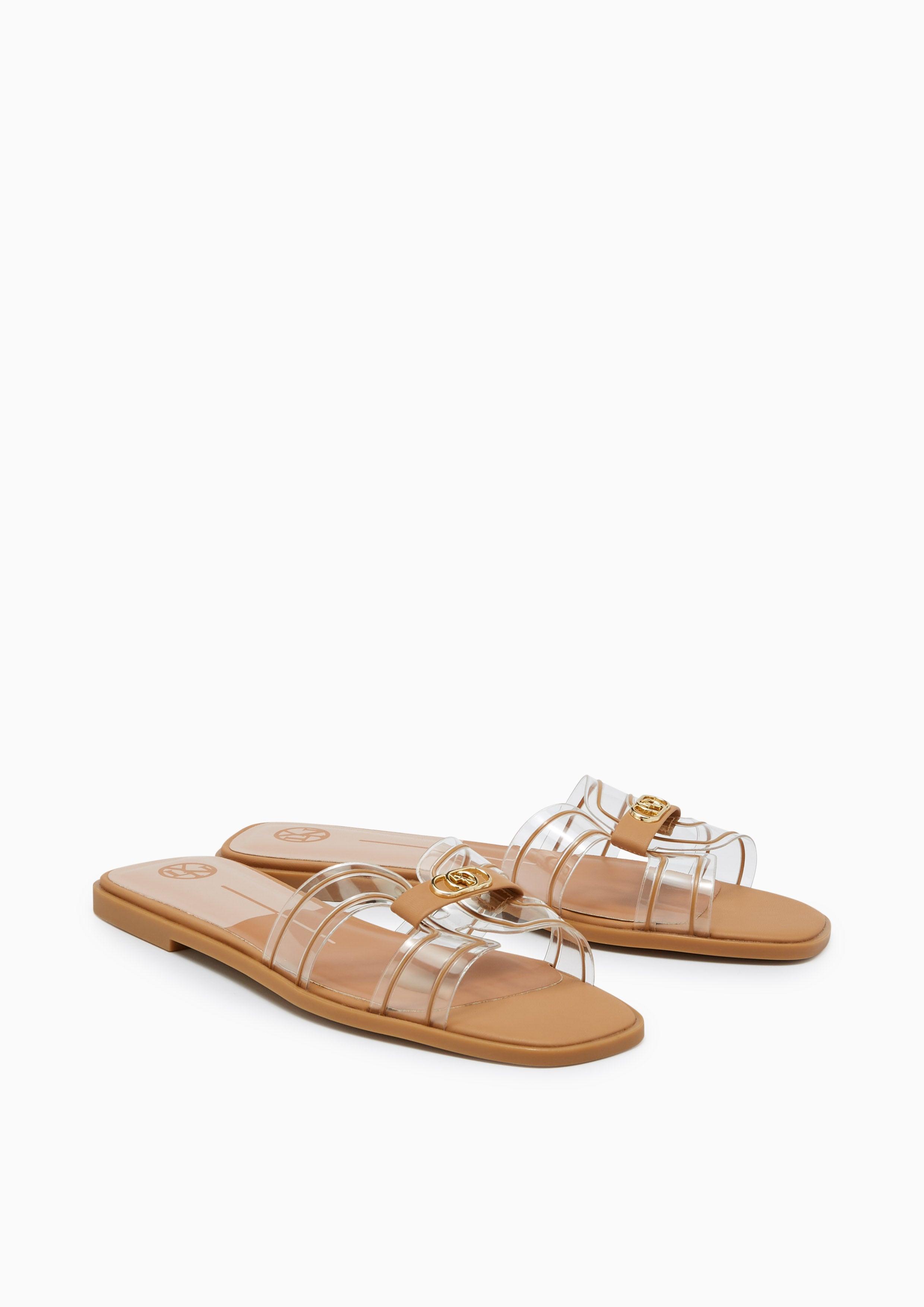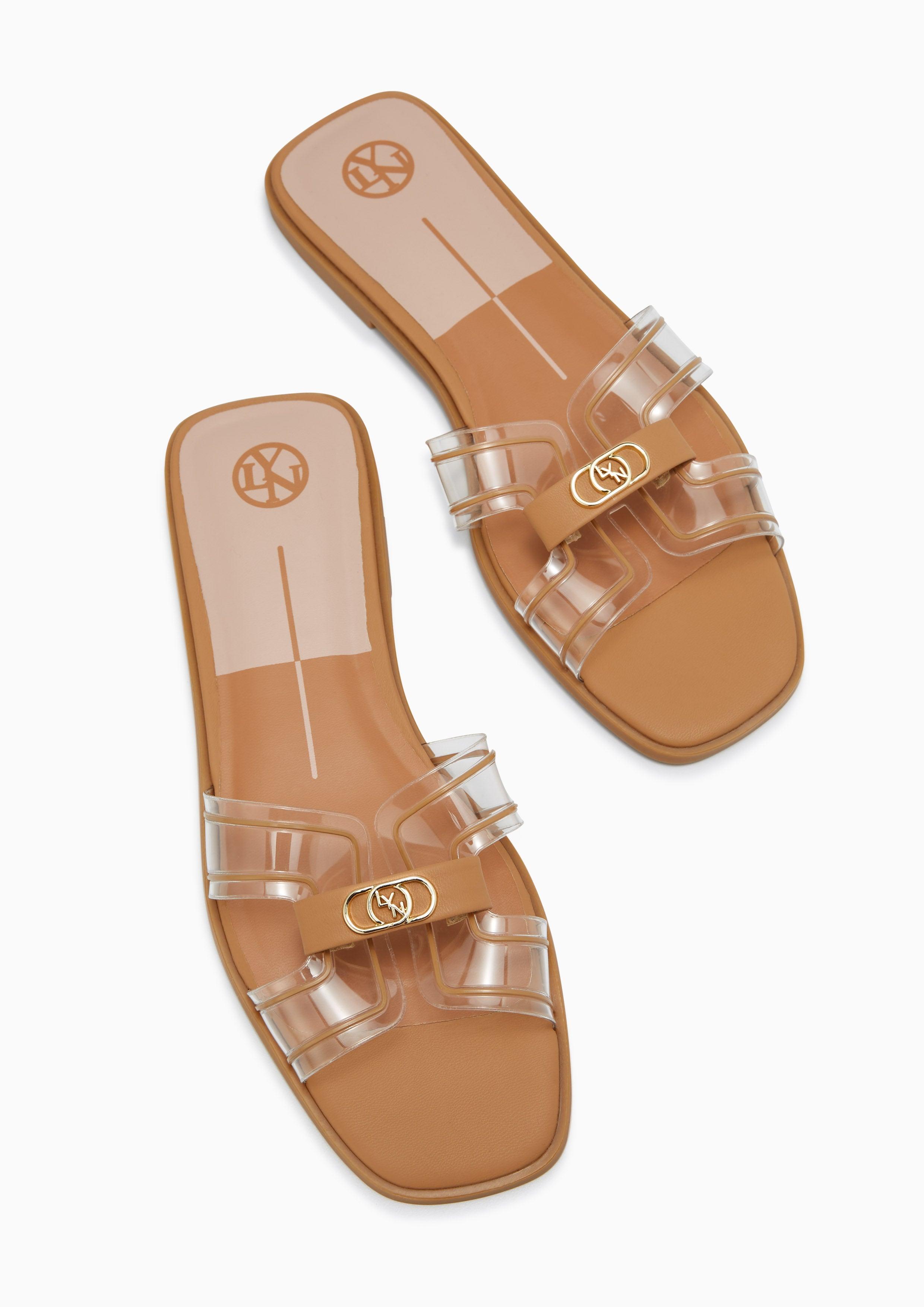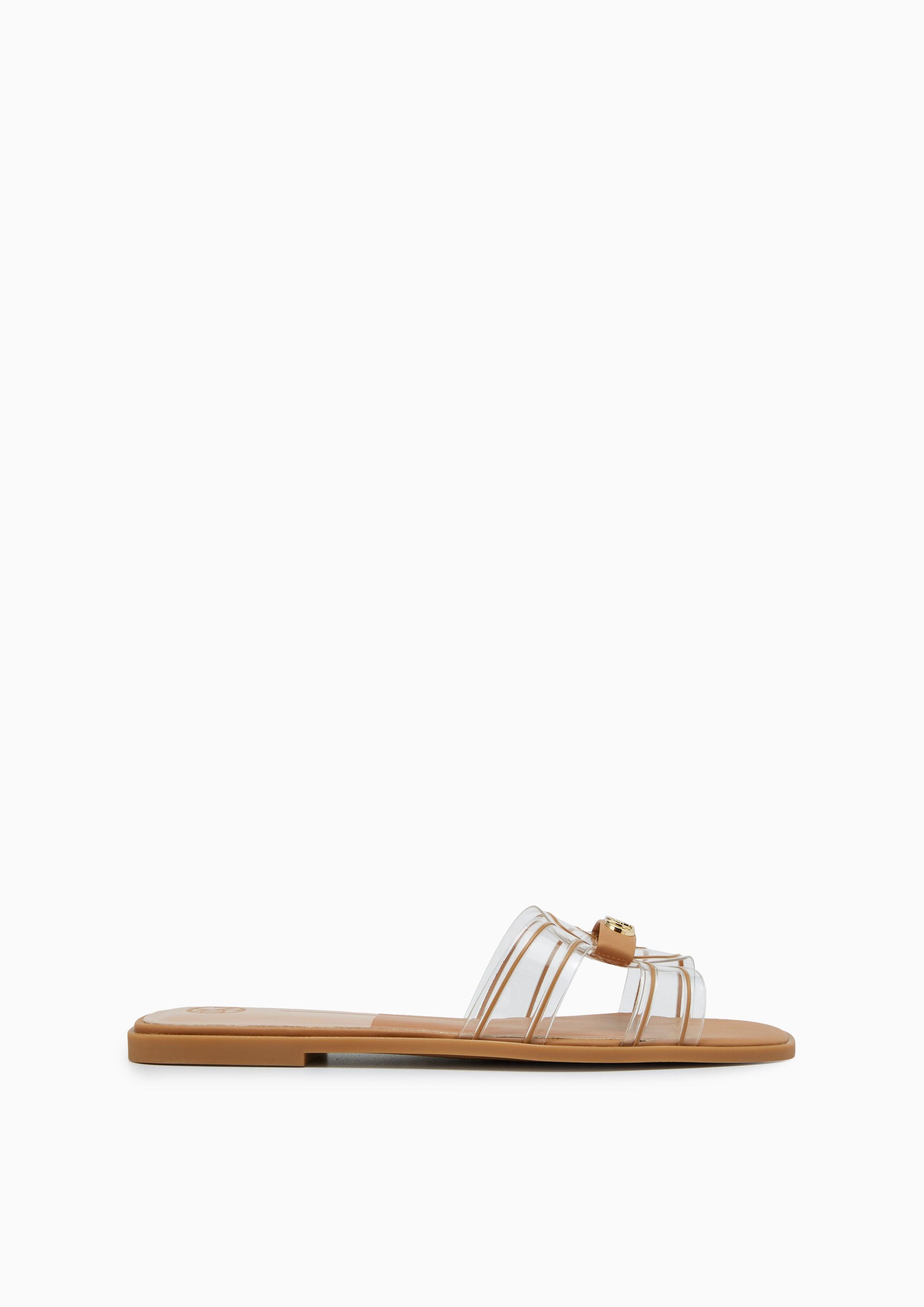 The Hey Clear Flat Slip-Ons by Lyn showcase a modern, transparent strap design accented by polished gold-tone logo details. Offering effortless comfort and stylish versatility, these slip-ons are ideal for everyday wear—from casual days to beach getaways. Elevate your daily look with fresh femininity and chic simplicity.
