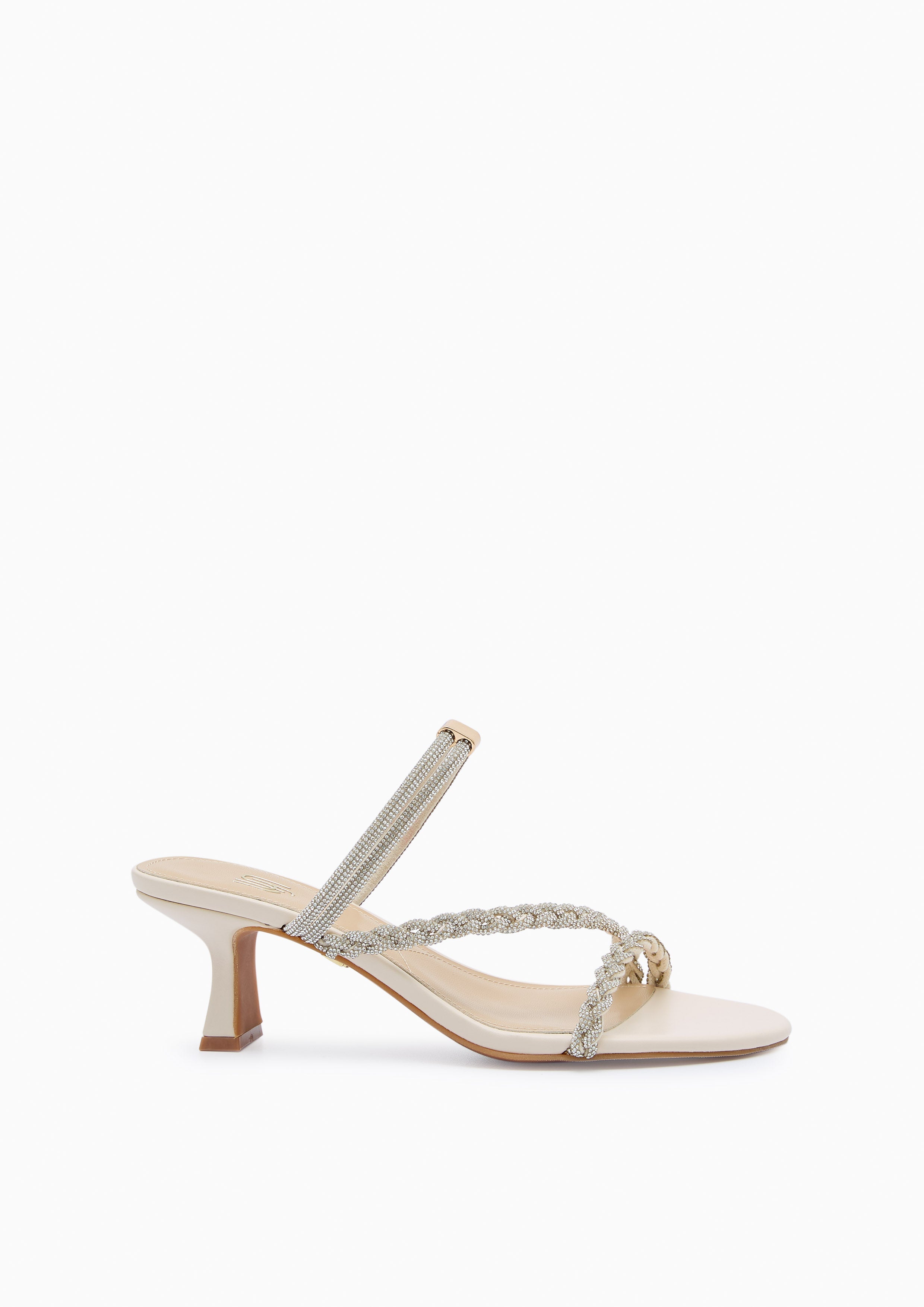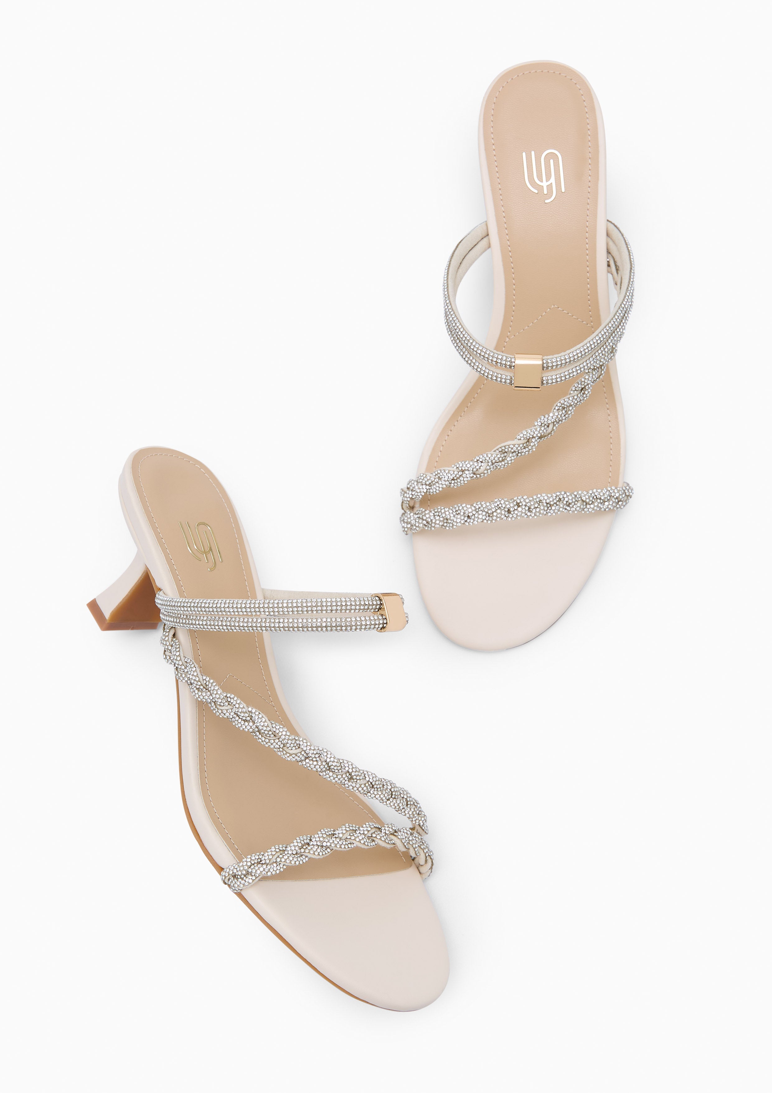 These high heels are elegant open-toe heels featuring a sleek and feminine design. They have a nude base with multiple thin, crisscrossing straps embellished with sparkling rhinestones, creating a glamorous and eye-catching look. The back strap helps secure the foot, while the mid-height heel adds a touch of sophistication without compromising comfort. Perfect for evening events, parties, or occasions where you want to add a bit of sparkle to your outfit.